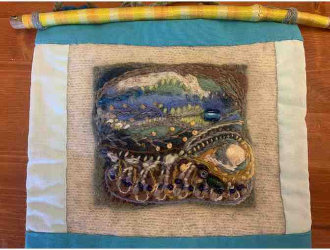 This Abstract Landscape was lovingly embroidered with 100% alpaca, sheep and llama wools, wool roving, vintage beads and Maine seashell on a 100% cotton and felted sweater background.