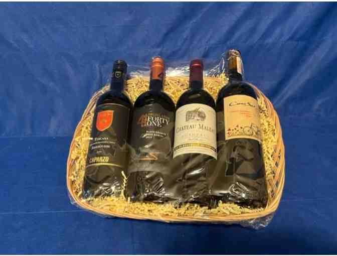 This beautiful basket of spirits contains "Four delicious Reds..."