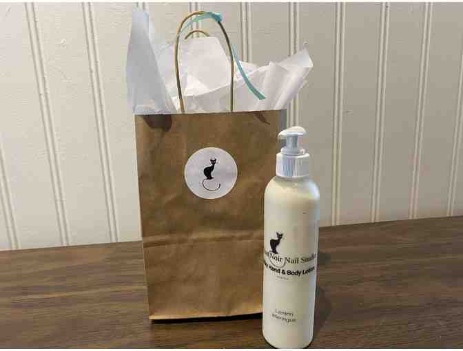 Gift certificate for a gel manicure with Christine at Chat Noir and a bottle of lemon meringue hand and body lotion.