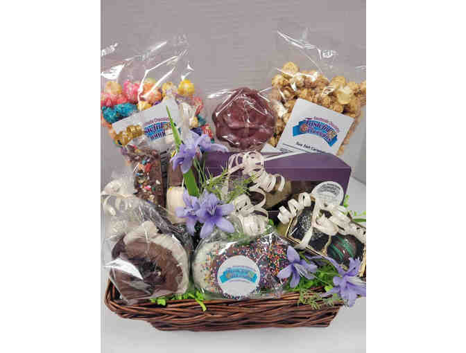 Enjoy a delicious chocolate and popcorn gift basket from Tasteful Thoughts.