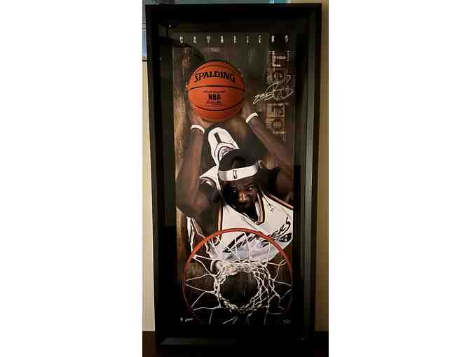 The autographed 3-D mini basketball and action photo display of Lebron James is donated by Bruce Weiner.