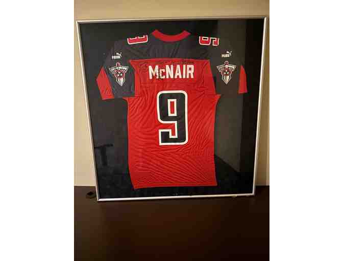 The winning bidder will receive signed Steve “Air McNair” autographed alternate throwback jersey from the 1999 Super Bowls, which is also signed by former Tennessee Titans Jevon Kearse "the Freak", Bruce Matthews, and 2 other Titans. The McNair jersey is in Mint Condition and has a Certificate of Authenticity from UDA.