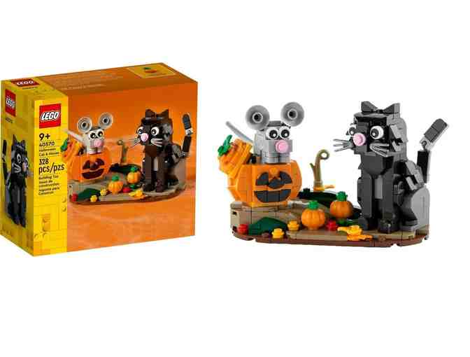 Build a cute seasonal display with this LEGO Halloween Cat and Mouse set. The adorable cat and mouse are playing hide-and-seek, and the mouse has found the perfect hiding spot inside a big pumpkin toy. Spot the mini pumpkins and colorful autumnal flowers that decorate the rotating base. This set makes a great addition to Halloween decorations and it makes a fun Halloween gift. Change up your next Halloween party by adding this fun craft to the festivities. Contains 328 pieces.