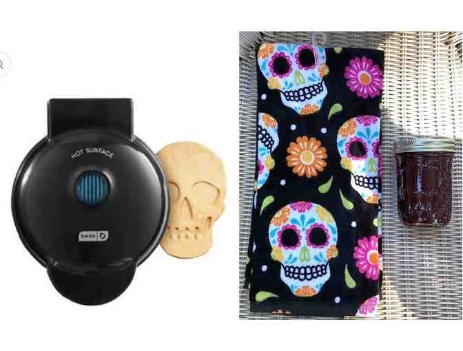 The Dash Skull Mini Waffle Maker is perfect for Halloween or any type of otherworldly breakfast gathering! With a 4 inch diameter and nonstick coating, you'll be making delicious mini waffles for all your best ghouls in just a few minutes. This Mini Maker comes with a plate inside that prints a cheerful skull on every waffle. No bones about it, these waffles bring a spooky touch to any meal. The PTFE nonstick makes cooking and cleaning easy. Includes a matching dish towel and an 8 ounce jar of blueberry maple syrup home made with fresh Ohio blueberries.
