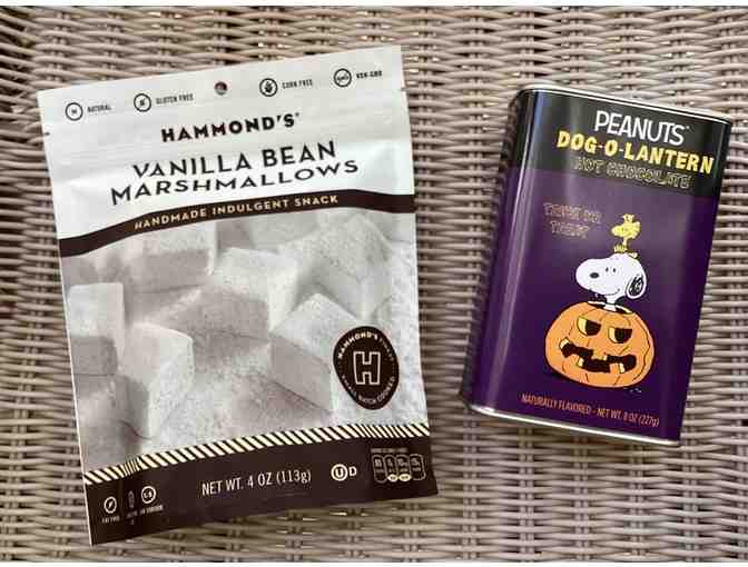 Delicious Peanuts Dog-O-Lantern naturally flavored 8 ounce tin of hot chocolate. Top it off with Hammonds gourmet handmade vanilla bean marshmallows. 4 ounce package. It doesn't get any sweeter than this! Both manufactured in the USA.