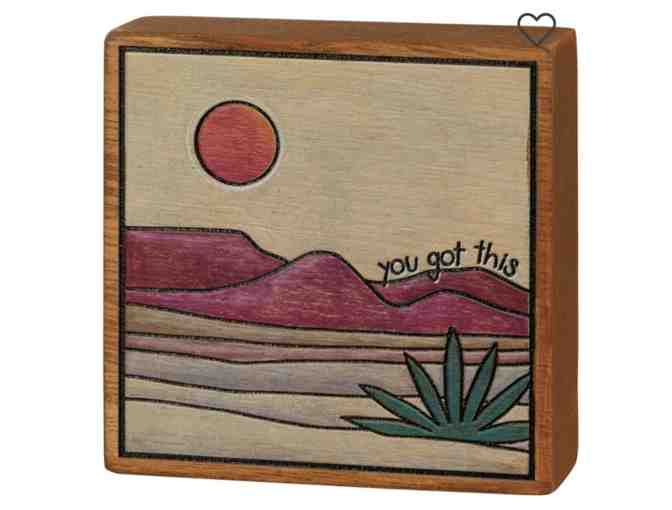 A block sign featuring beautiful wood burned desert designs and a muted color palette. Features "You Got This" sentiment. Easy to hang via predrilled keyhole or can free-stand alone.
