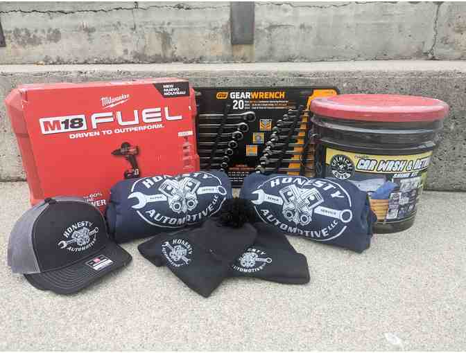 Generously donated by Honesty Automotive in Missoula, this amazing lot consists of a car wash and detailing shine kit, Gearwrench 20 piece combination ratcheting wrench set, Milwaukee M18 drill kit (Drill/Driver, 2 batteries, 1 charger, and 1 carrying case), two Honesty Automotive hoodie sweatshirts (both size medium), two Honesty Automotive baseball hats, and two Honesty Automotive beanies. What a great package!!