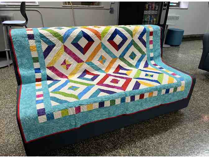 HEARTFELT QUILT. A one of a kind hand crafted large patterned and colorful quilt for the comfort of your home. It could be uses as a lap quilt, tabble runner, wall-hanging decor, and more. Don't miss this one of a kind item!