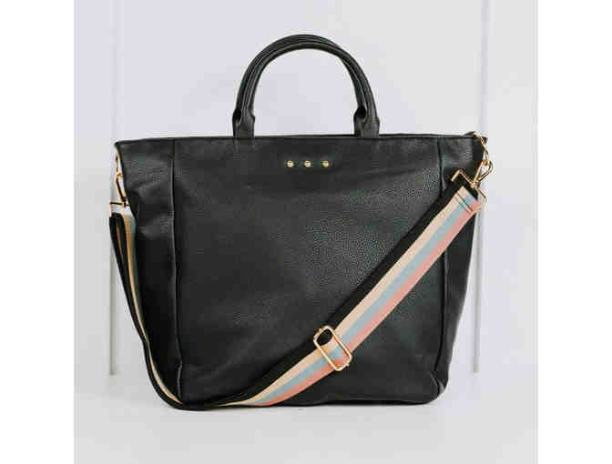 The Kaia Vegan Leather Commuter Tote is ideal for transporting all your essentials in a chic and functional fashion. Designed with comfy double carry handles, a roomy open interior, and several small pockets to help you organize the tote to accommodate your busy lifestyle. Additionally, a contrasting canvas guitar strap allows the tote to be carried on the shoulder or as a crossbody--3 ways to carry! The perfectly versatile bag, great for work and travel! Vegan leather Black Zipper closure Gold hardware Metal protective feet 3 interior pockets Detachable, adjustable 29" x 52" canvas crossbody strap with a 2.75" width Measures approx. 10" x 14"