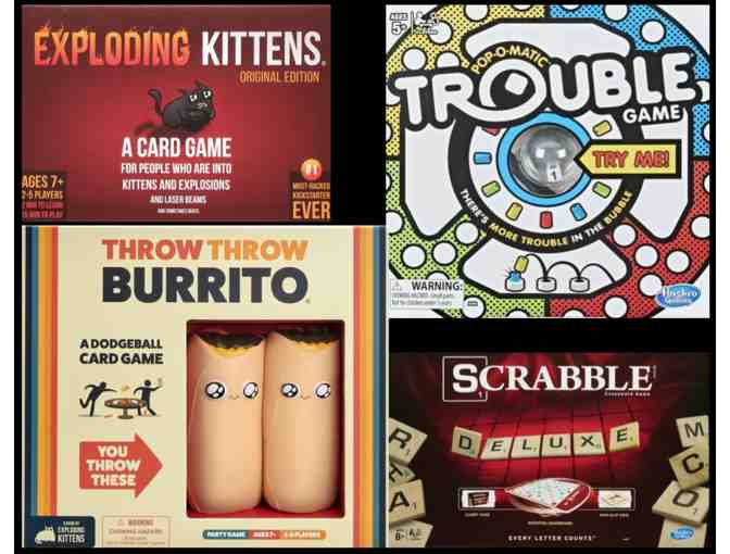 We have lots of options ranging from the classics like "Trouble" and "Scrabble" to newer games like "Exploding Kittens," "Throw Throw Burrito," and "Stardew Valley."
