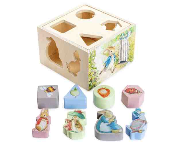 This super cute, charmingly detailed wooden shape sorter by Kids Preferred features artwork from The Tale of Peter Rabbit on character and shape blocks.