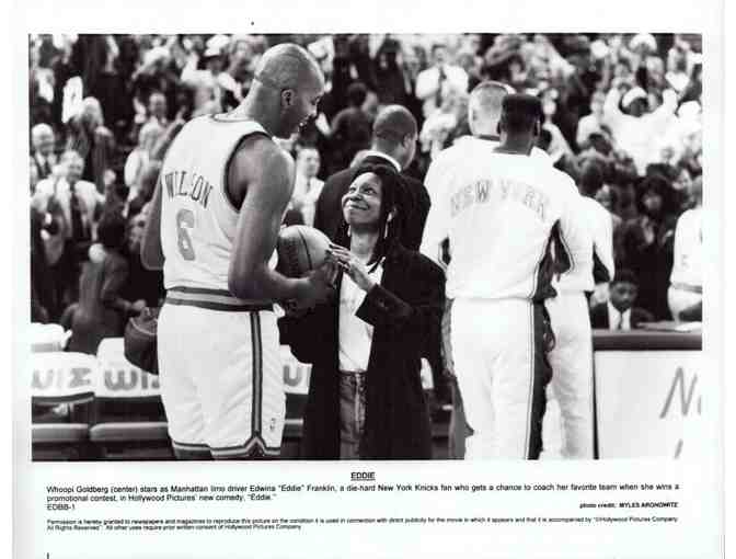 Eddie, the 1996 Steve Rash N.Y. Knicks basketball sports comedy starring Whoopi Goldberg, Frank Langella, Dennis Farina, Richard Jenkins, Donald Trump, Walt Frazier, Mayor Rudolph Giuliani, Fabio and actual NBA basketball teams: Hawks, Lakers, Cavvliers, Spurs, Pacers, Suns and Hornets.