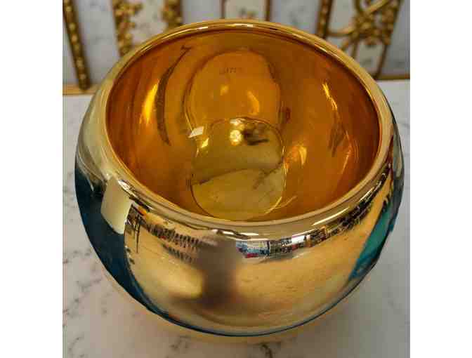 Offered for auction is a gold-colored metal bowl, measuring 10 inches in height and 14 inches in diameter.