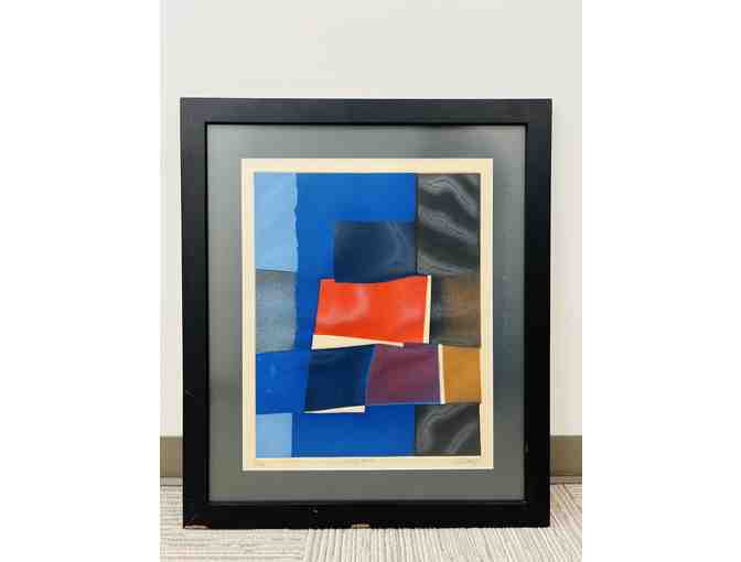 This abstract artwork is a vibrant interplay of bold colors and geometric shapes, creating a sense of movement and depth. The juxtaposition of deep blues, fiery reds, and warm golds against a textured background evokes a feeling of controlled chaos—where contrasting elements coexist in a visually striking balance. The layered composition suggests themes of structure and spontaneity, as if the fragments are pieces of a larger story waiting to be assembled. With its dynamic energy and intriguing textures, this piece invites the viewer to interpret its meaning through their own lens.