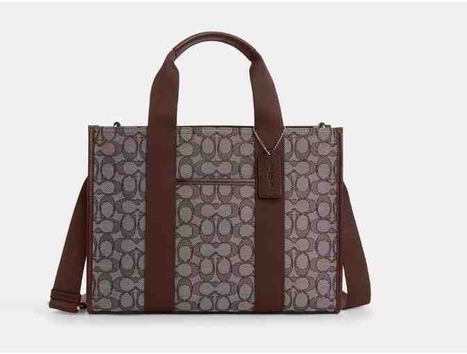 The Coach Smith Tote Bag is perfect for exploring town and commuting to work. Crafted of Signature jacquard and refined pebble leather, this women's tote bag can carry all your essentials and then some—from laptops up to 13" to your favorite book. It also has an outside open pocket for items you need quick access to on the go. With its detachable strap, you can style this pebbled leather tote bag from a shoulder bag to a crossbody, making it a versatile addition to your wardrobe.