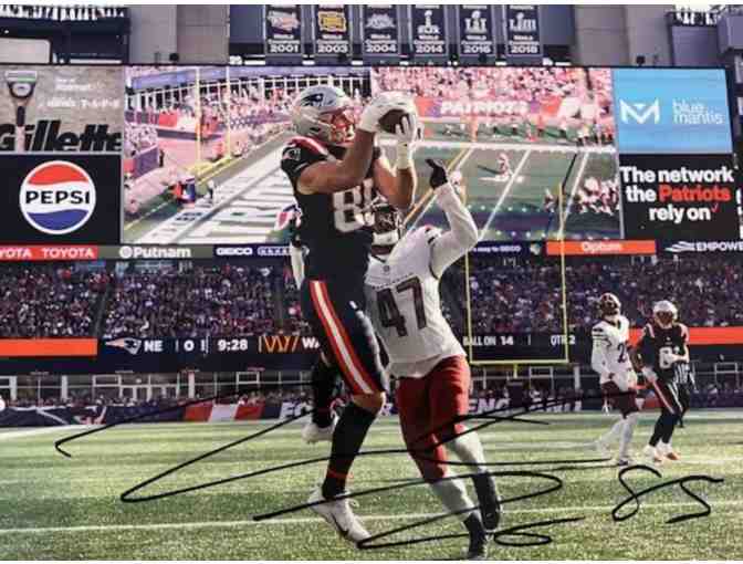 Size is 8x10 and is framed. Donated from the New England Patriots with certificate of authenticity.