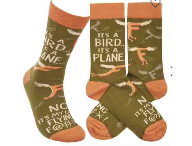 A pair of colorful woven socks from our LOL Made You Smile Collection displaying hand illustrated designs of the letter F with wings and a sentiment that reads "It's A Bird... It's A Plane... No... It's My Last Flying F@#*!" Socks feature a one size fits most design made with cotton, nylon, and spandex.