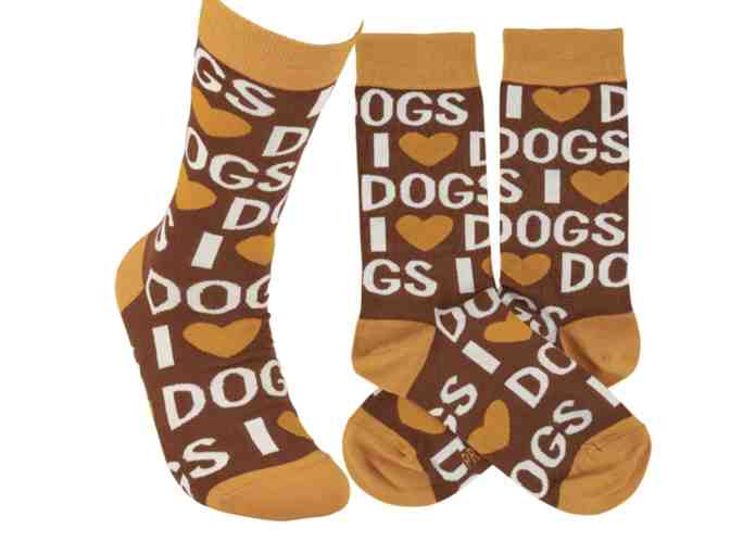 A pair of colorful socks from our Pet Collection displaying a repeating pet-themed sentiment that reads "I Love Dogs" Socks feature a one size fits most design made with cotton, nylon, and spandex.