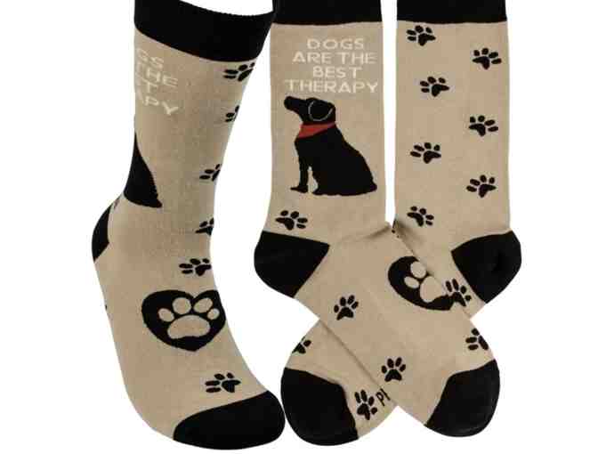 These colorful socks feature woven designs with coordinating "Dogs Are The Best Therapy" sentiment. Cotton, nylon, spandex. One size fits most.