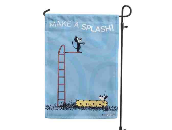 This colorful, 12" x 18" garden flag for animal lovers features Mooch ready to jump off a diving board into Earl's kiddie pool along with the phrase, "Make A Splash!" in decorative white font. Display this flag in your garden, on your front lawn, in your backyard, near your front door, or anywhere else you please.