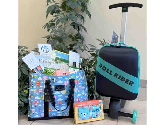 Six Montessori continent puzzles and a book describing kids around the world will bring learning home and inspire your next global adventure. A Roll Rider kids’ scooter suitcase, luggage tag, and passport holder will get your little traveler ready to go down the street or across the world. A world scratch-off map will beautifully track your family’s trips. Tucked into a travel-themed SCOUT tote bag, alongside all the items above, is a collection of beloved global recipes from families in Miss Kiess’s class. We love to travel far and wide, and hope that these recipes and everything else in our basket will inspire you to do the same!