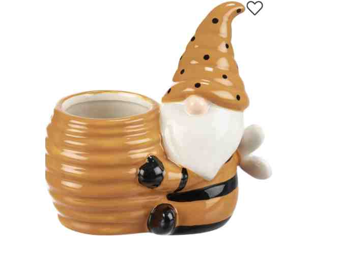 A ceramic planter from our Garden Collection displaying a gnome dressed as a bee hugging a beehive. Our Gnome with Honey Pot planter features opening in beehive to place plants or small decor.