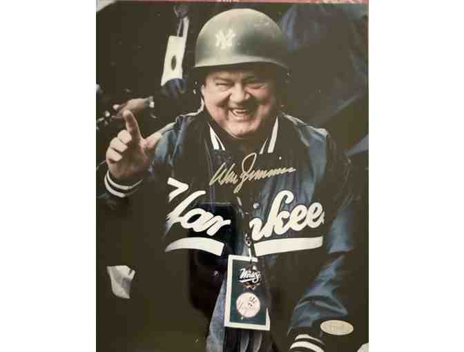 Zip Zimmer signed this iconic photo from a Yankees game where a Derek Jeter foul ball alomost knocked Zip on the noggin. Classic dugout fun in the Bronx. Grab this item and a hard find autograhed item.