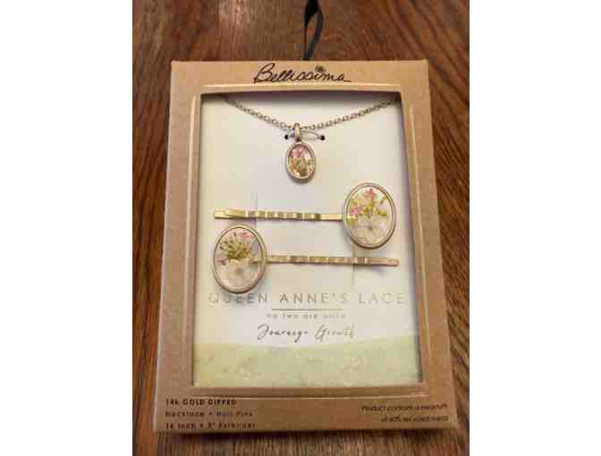Gorgeous Bellissima Queen Anne’s Lace Necklace and Hair Pins. 14 K gold dipped, 16 in. chain with a 3 inch extension.