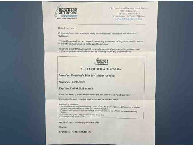 Northern Outdoors Gift Certificate Rafting Trip For 2