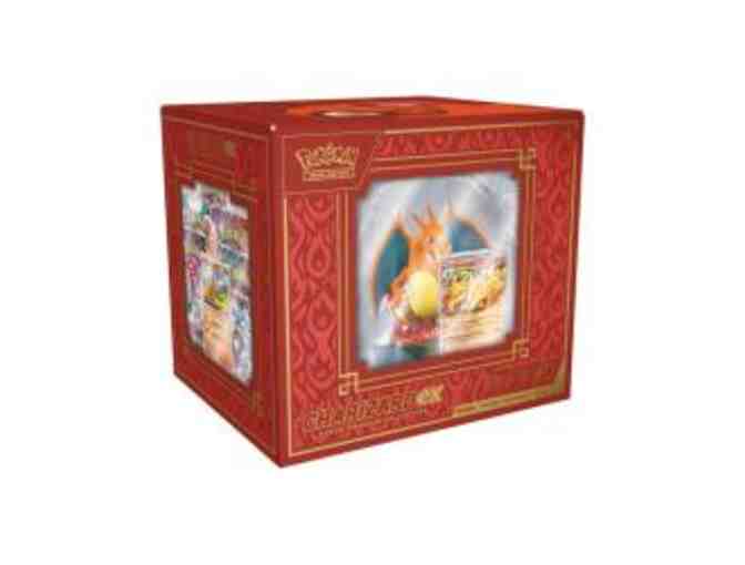 Charizard Guards Your Favorite Card! With explosive attacks and huge HP, Charizard ex has a commanding presence on the battlefield! Bring that burning tenacity to life on your desk, bookcase, or nightstand with an awesome Charizard figure featuring translucent fire effects to show off a favorite card—like the foil Charmander, Charmeleon, or Charizard ex you also get in this collection! Even more fun awaits in a stack of 10 booster packs from different Pokémon TCG expansions.