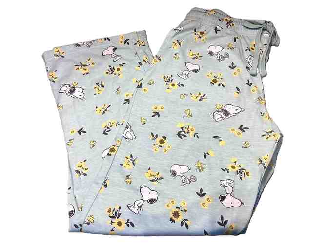 Perfect for Spring, you will love the charming style of these Snoopy pajama pants. Features elastic waistband with functional drawstring and two pockets. 60 percent cotton 40 percent polyester. Light teal green. Size Large.