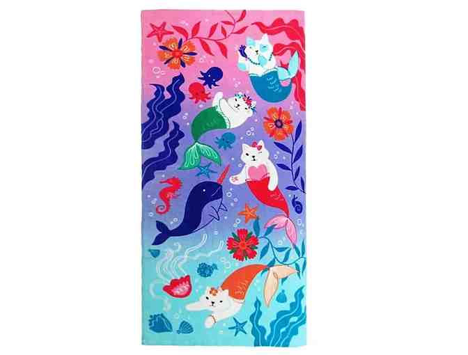 Fun colorful mermaid kitty graphic beach towel. Cotton quick dry design. 28 x 58 inches.