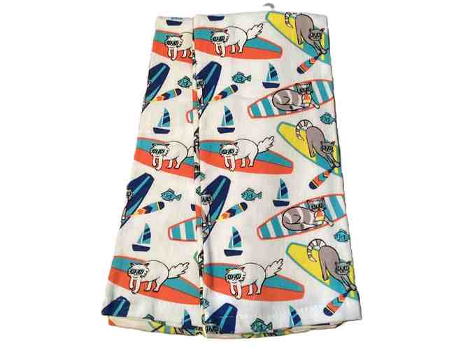 Set of two nice quality summer cat themed dish towels. 100 percent cotton. Smooth on graphic side and terry cloth on the back.