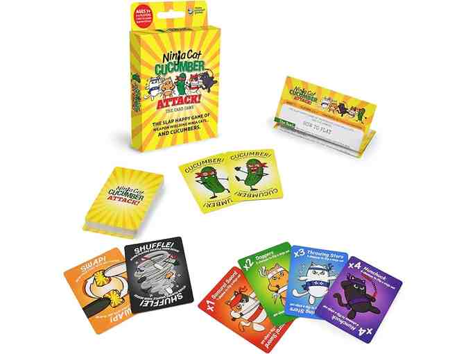 Get slapping in this exciting, fast-paced card game where Ninja Cats battle and Cucumbers attack. Play against others to control the deck as you flip and slap your way to victory. Win cards by battling weapon wielding Ninja Cats, but be ready to steal the deck as you beat your opponents by slapping card combos first. Players take turns flipping cards into a pile at the center of the table. If a player flips a number card, game continues to the next player. If a Ninja Cat card is flipped, the battle begins! The following player then has the number of chances indicated on the card to flip over their own Ninja Cat card. If they do, play continues to the next player, and the battle begins again. If they don't, the player who initially flipped the Ninja Cat card wins the pile! Keep an eye out for card sequences which can be slapped at any time during the game, as the first person to slap them gets to collect the pile. But watch out for that sneaky CUCUMBER, because when it's flipped you must ATTACK! First person to slap the cucumber wins the pile! Special action cards make the game more intense by forcing players to shuffle or swap their whole deck. Collect the whole deck to win the game! 2-4 players ages 5 and up, making it perfect for family game nights and a great gift option for an Easter basket.