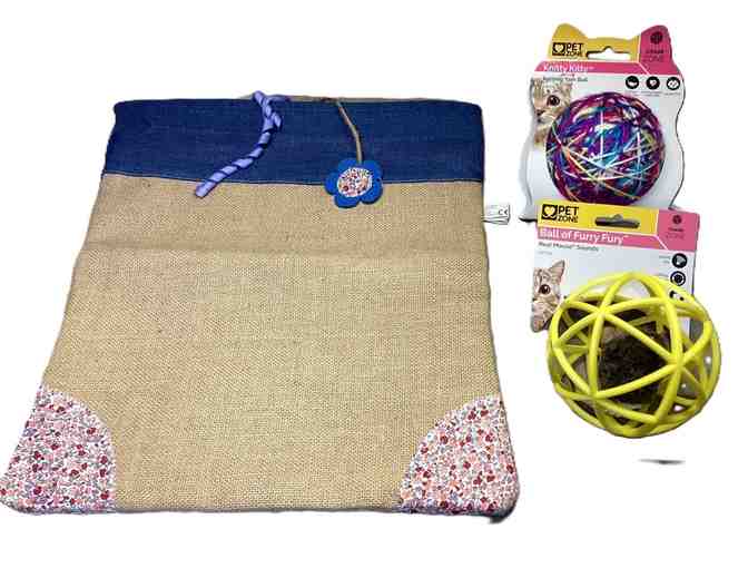 Fun set of cat toys to relieve anxiety, stress, and boredom. Includes a 15 x 13 burlap crinkle sack; 13 inch diameter rattling yarn ball; and a 15 inch diameter Ball of Furry Fury featuring electronic RealMouse technology that mimics a real mouse in the wild stimulating your cat's natural hunting instincts.