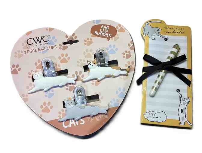 Set of three cat bag clip buddies. Feature magnets on the back so they will stick to metal surfaces. Cats measure 3.5 inches long. Fun 8 x 3.5 inch cat themed 75 sheet list pad with pen.