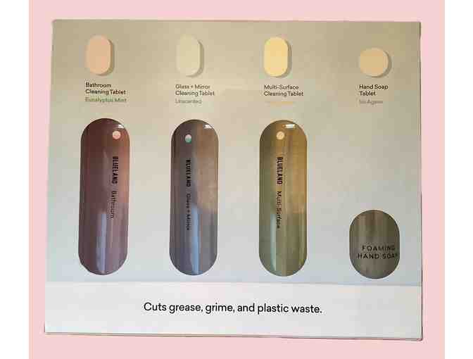 Our four best-selling products all in one. Our Hand Soap, Multi-Surface Cleaner, Bathroom Cleaner, and Glass + Mirror Cleaner have all of the plant-based power without any of the single-use plastic. Made to keep our home and planet in tip top shape. Clean Powerfully Effective: Tried, tested and proven to perform alongside major brands. Starter kit includes four high quality long lasting, refillable plastic bottles and one tablet. Also included are extra packages of three refill tablets for glass and mirror (unscented); bathroom (eucalyptus mint) and six tablets of foaming hand soap (perrine lemon and lavender eucalyptus). Each tablet makes 24 ounces of cleaning product and 9 ounces of foaming hand soap product. Sold at major retailers. More information at blueland.com.