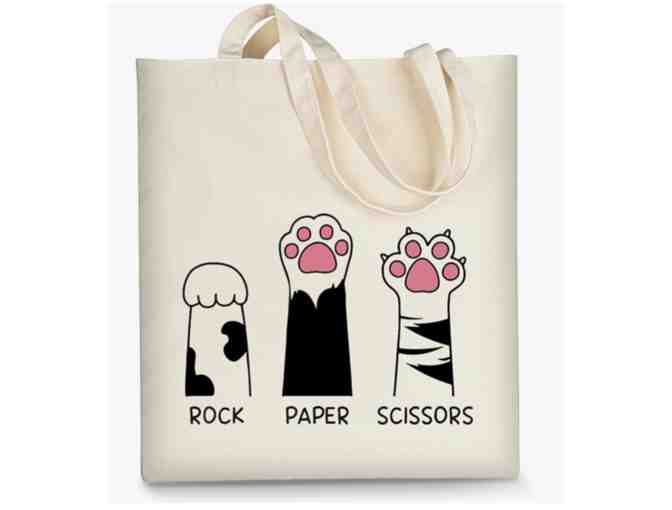 Fun, reusable bag with picture of Cat Rock Paper Scissors. Cat toys and treats included in the bag.
