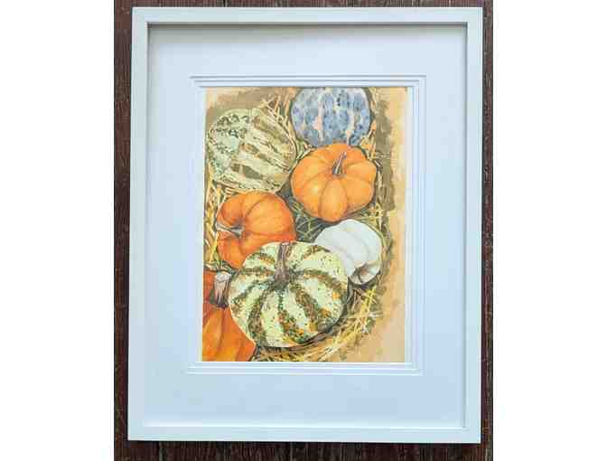 Jane Woker, a local Hancock County artist, painted this eautiful fall painting featuring a variety of vibrant pumpkins nestled among golden leaves, with soft sunlight casting a cozy glow over the scene.