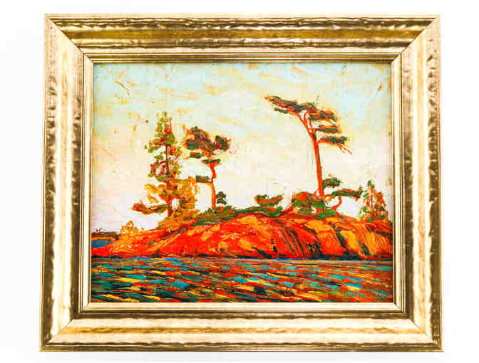 Group of Seven Artist Tom Thomson's "Split Rock", Oil on Panel (8x10"). (Limited Edition /460) with Phoenix Marque Authenticity, 24kt Gold Leaf embossing on verso, and gallery gold leaf frame. Preserving the Past for Future Generations.