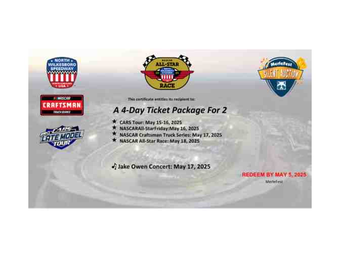 Rev up your engines for the ultimate racing experience with the North Wilkesboro 2025 NASCAR All-Star Weekend Package! This exclusive package gives you access to all four of the thrilling events including the CARS Tour, NASCAR All-Star Friday, NASCAR Craftsman Truck Series, a concert with multi-platinum country music sensation Jake Owen, and the NASCAR All-Star Race. Get in on the high-speed action at a legendary track.