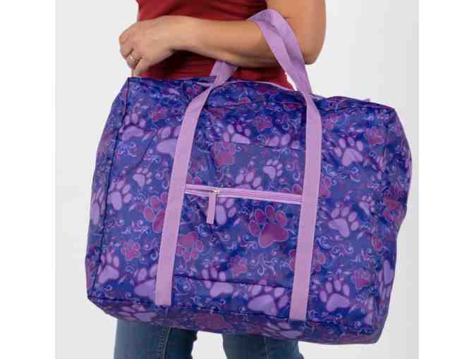 Swirls and paws in purple hues pattern this royal blue packable duffel bag for a cute and animal-friendly way to travel. Made with a lightweight polyester, this bag takes up little-to-no space while also having a pretty sizable capacity -- spacious and easy to pack up for a weekend away!