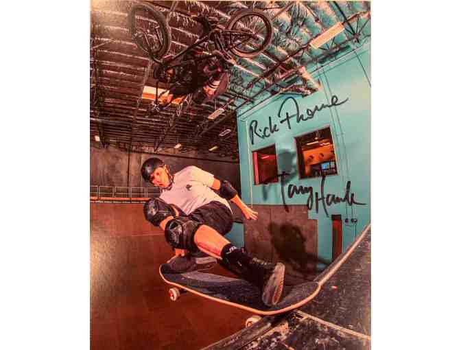 a gnarly dual autographed photo by skateboard legend Tony Hawk and great BMX rider Rick Thorne. both catching some serious air with one of their trademark tricks!!
