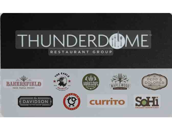 This is a $50 Gift Card from the Thunderdome Restaurant Group valid at: Bakersfield, the Davidson on the Square, The Eagle, City Bird, Currito, Krugger's, Maplwood Kitchen and Bar, Pepp & Delores and SoHi.