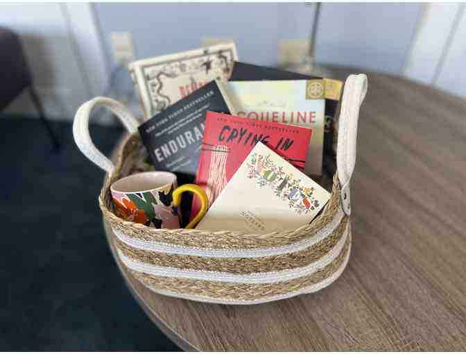 Curl up with a good book from this beautiful basket of curated books. Also included in the basket are a notebook and pen and a big mug for you to enjoy your favorite hot drink!
