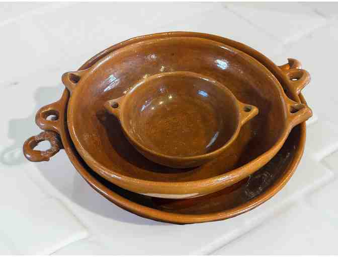 Vintage set of four handmade rustic, Mexican redware clay, combo glazed micaceous, handled nesting bowls. C 1970s. The color is a lovely rusty reddish brown, natural glaze, and aged patina. Terracotta bowls are cured and should only be used as serveware, not cookware.