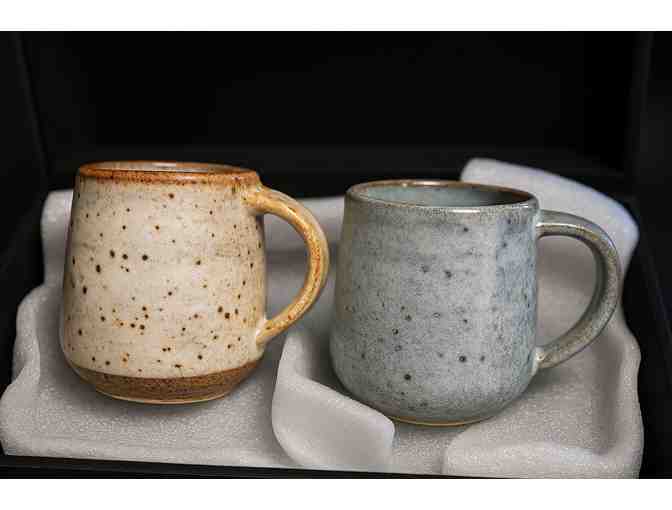 A beautifully crafted gift box featuring two handmade ceramic mugseach a unique work of art by Colombian artist Ana Maria Sanches, perfect for collectors or lovers of artisan pottery.