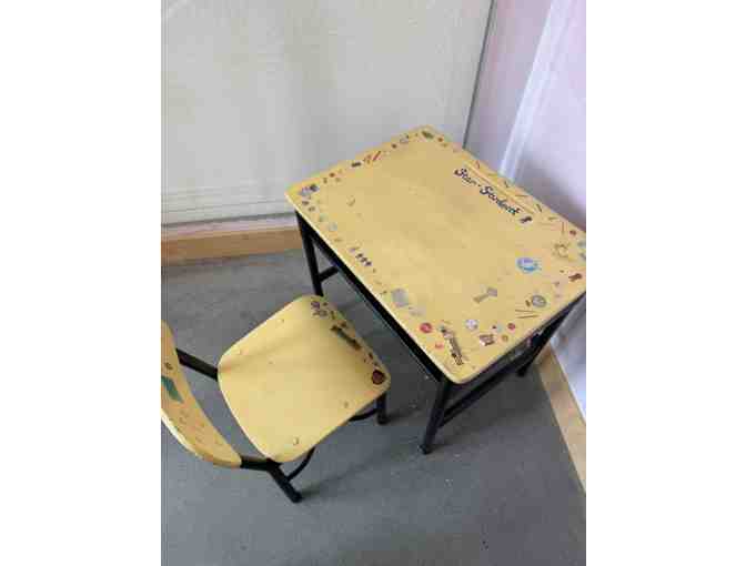 Vintage school desk and desk. Decorated with fun remembrances from the past. Perfect for a young child's room.