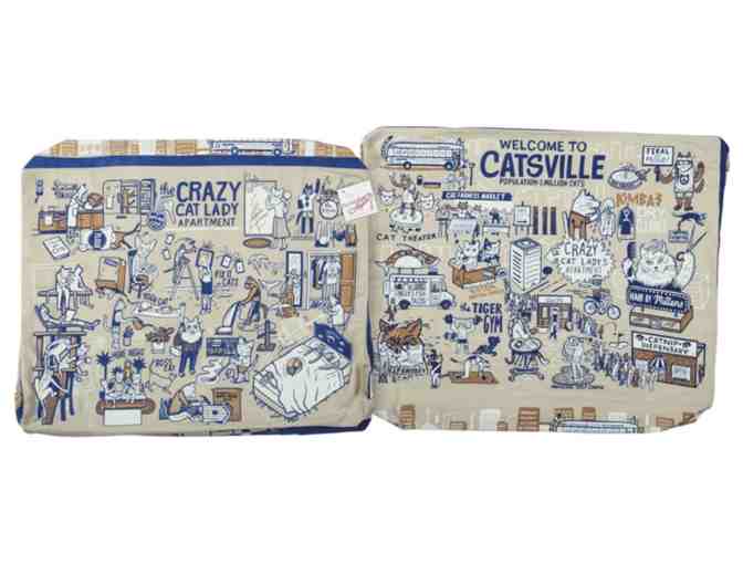 Cotton pet bed cover with a zipper closure. Fill with one standard size pillow and/or stuff with blankets or clothing items so your pet always has something comforting with your scent on it. Features double-sided cat themed designs with "Welcome to Catsville Population: 1 Million Cats" sentiment on one side and "The Crazy Cat Lady Apartment" sentiment on reverse side.