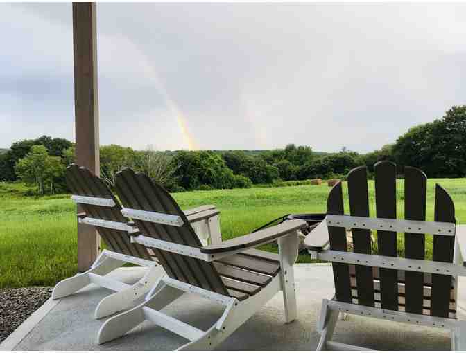 Picture yourself in this serene, newly built (2021) house, only 1¼ hours from Belmont. Bring your family and/or a few friends and enjoy a week of Rhode Island coastal life. The house is set in a beautiful area that boasts multiple cycling paths and opportunities for extended nature walks. Farms, waterways, birds, and stone walls abound. The house has 4 bedrooms and 2 baths and sleeps 8-10 (3 queen beds and 1 king bed). The king is in a large loft with AC and sturdy ladder access; it can be separated into 2-4 twins to fit more people. Amenities include: central air, Wi-Fi, a fully stocked kitchen, TV with cable, washer/dryer, and an outdoor shower. The porch has six Adirondack chairs and a fire pit; it overlooks a 3-acre meadow and a pond beyond. One man's bike and one woman's bike are available. Multiple beaches are just 5 to 15 minutes away by car, and historic Tiverton Four Corners is only half a mile away. There you can find shops, galleries, a café, a restaurant, and an ice cream place. Sakonnet Winery and two pickleball courts are also nearby. Available for one week in the summer of 2026 (NOTE: 2026, not this summer)the exact week to be determined in coordination with owners. Winning bidders are kindly asked to leave the house as they found it (take out trash, launder towels/sheets, etc.).
